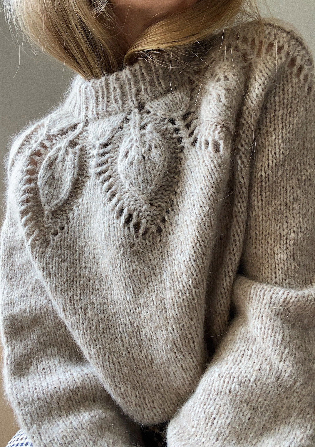 Chunky Dahlia har et bærestykke, som legger seg pent om skuldrene og kropp og ermer har en loose passform. Strikket ovenfra og ned.