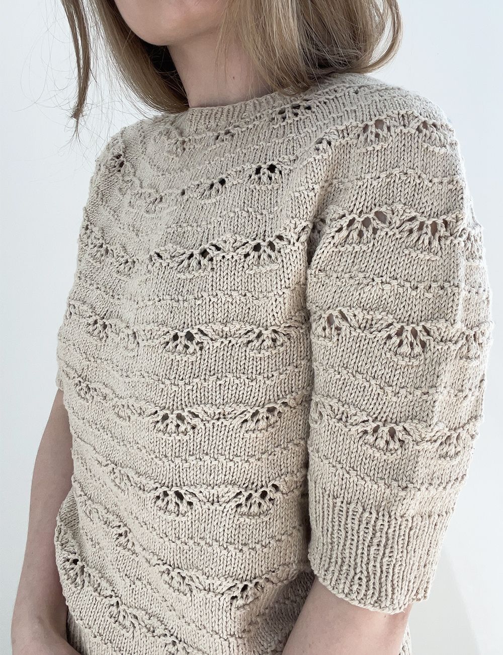 Den delikate borden på Musling Tee ligner små skjell på rad og rekke, og mønsteret trer så fint frem i et garn med lin og bomull. Musling Tee strikkes ovenfra, så du bestemmer selv lengden på ermer og bol. Det er vendepinner øverst for en bedre passform.