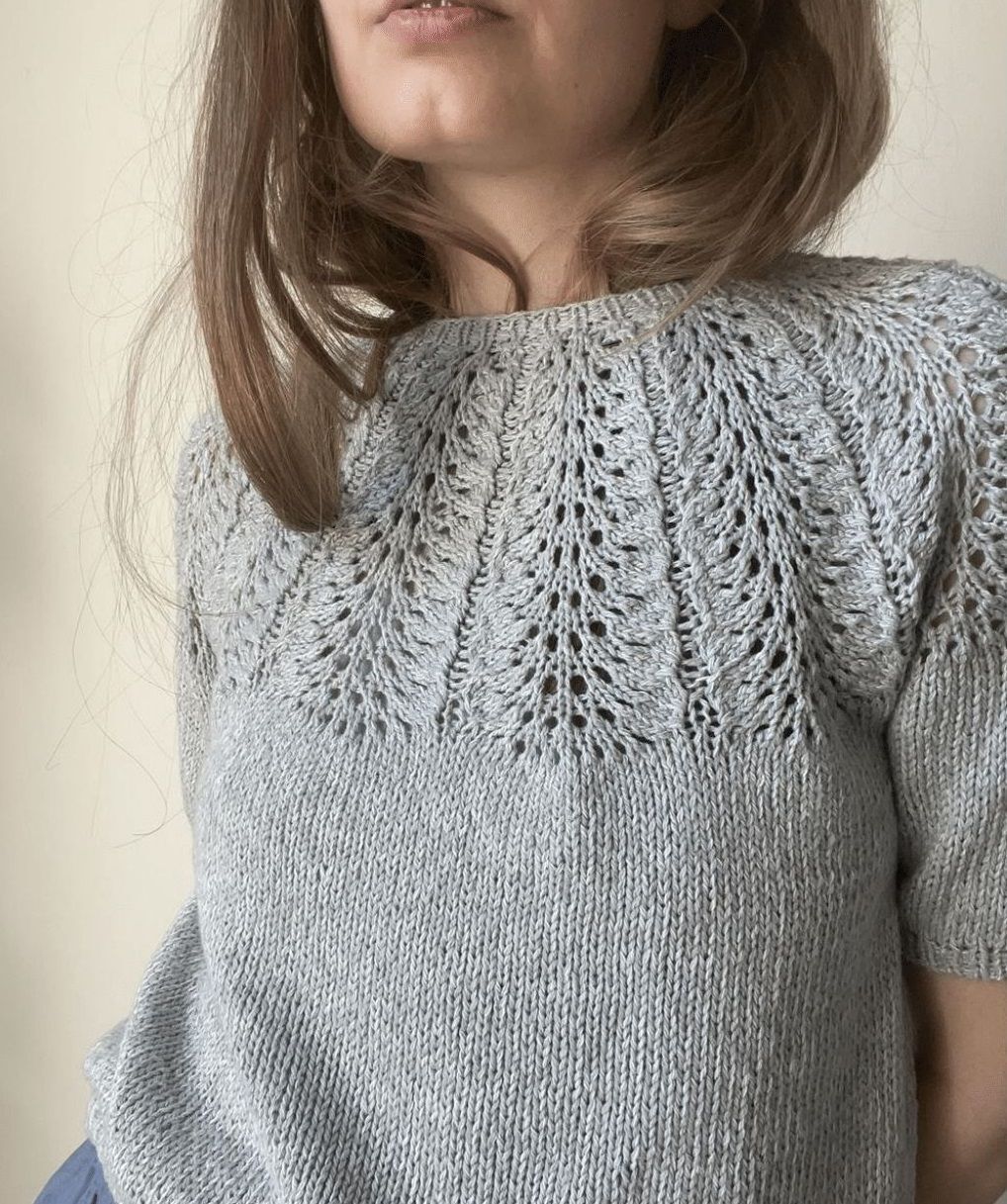 Palme tee har et nydelig hullmønster på det runde bærestykke. Den strikkes ovenfra og ned.