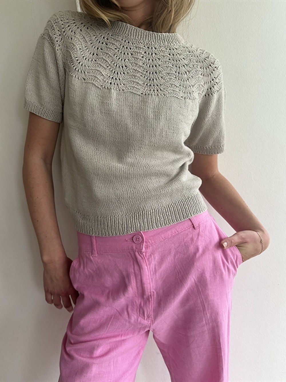 Peacock shirt strikkes ovenfra, og halsutskjæringen dannes ved hjelp av vendepinnere etter halskanten er strikket. De enkle kombinasjoner av hullmønster og vrangmasker på bærestykket danner en delikat struktur, samtidig er den underholdende å strikke.