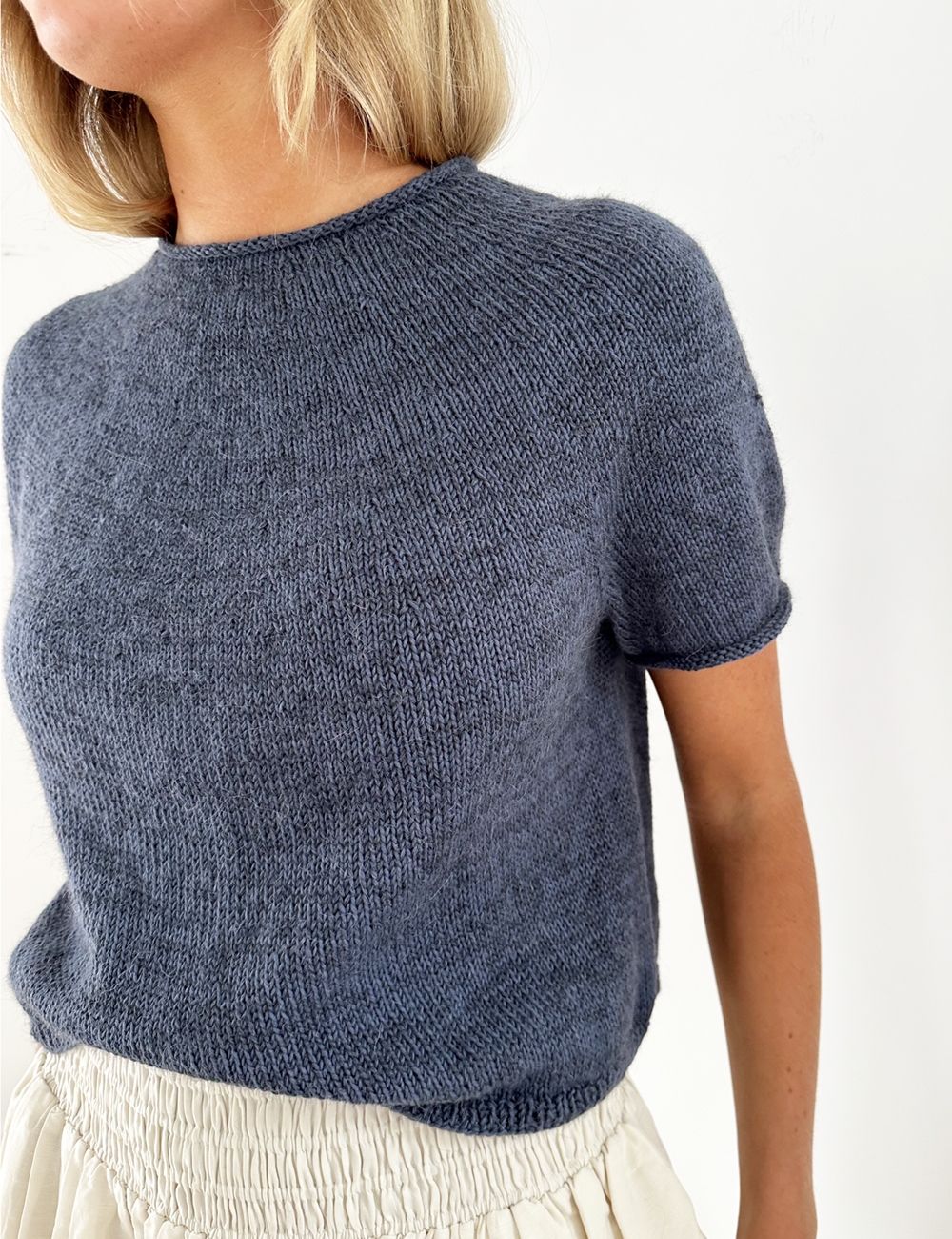 Plain Yoke Tee strikkes ovenfra og ned i mandarin petite sammen med alpakka følgetråd. I oppskriften finner du både debutant-edition og detailed-edition. Den eneste forskjellen mellom de to er at det i detailed-edition strikkes vendepinner i nakken og dermed får denne modellen en halsutringning som er dypere foran enn bak. Dette gir en finere form på halsen. Om du dropper vendepinnene, som i debutant-edition, strikker du utelukkende rundt i rettmasker.