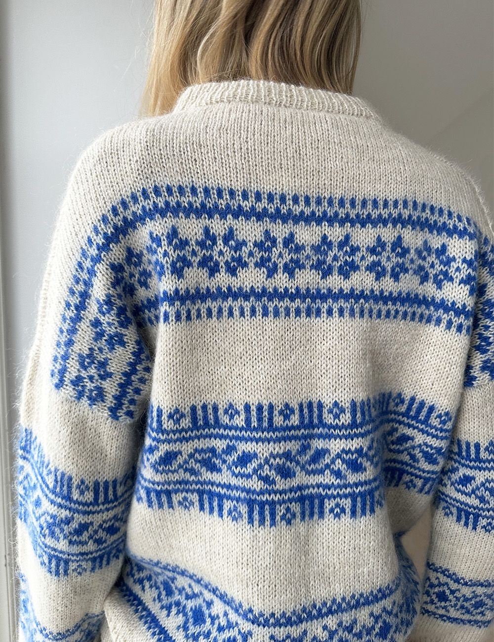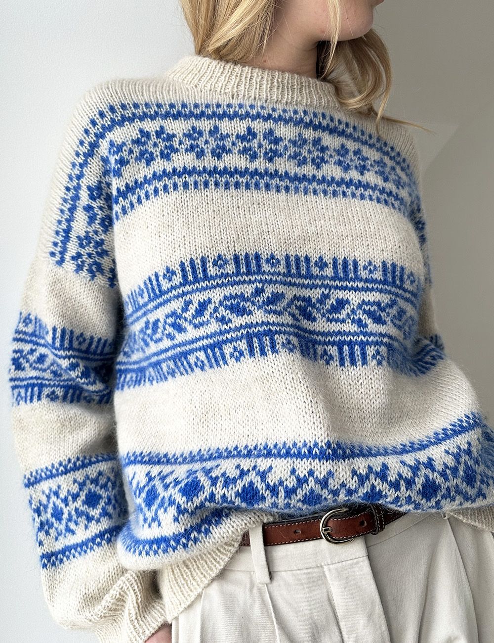 Porcelain sweater har 3 flotte border med mønsterstrikk på bolen og 2 på ermene. Du kan strikke den ovenfra eller nedenfra, det er forklaring til begge deler. Porcelain sweater blir fin i kontrasterende farger, men også i to farger som ligger nærmere hverandre.