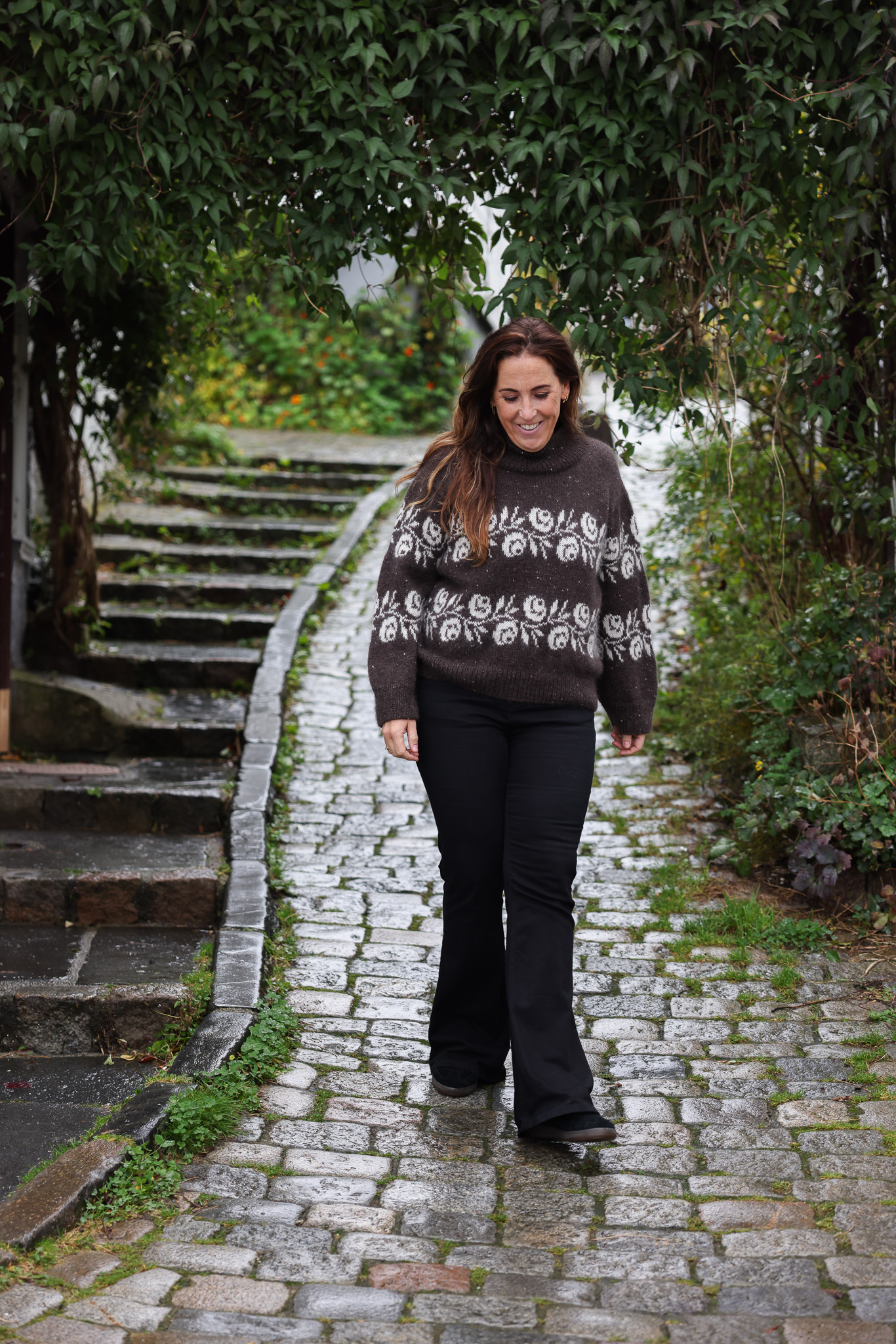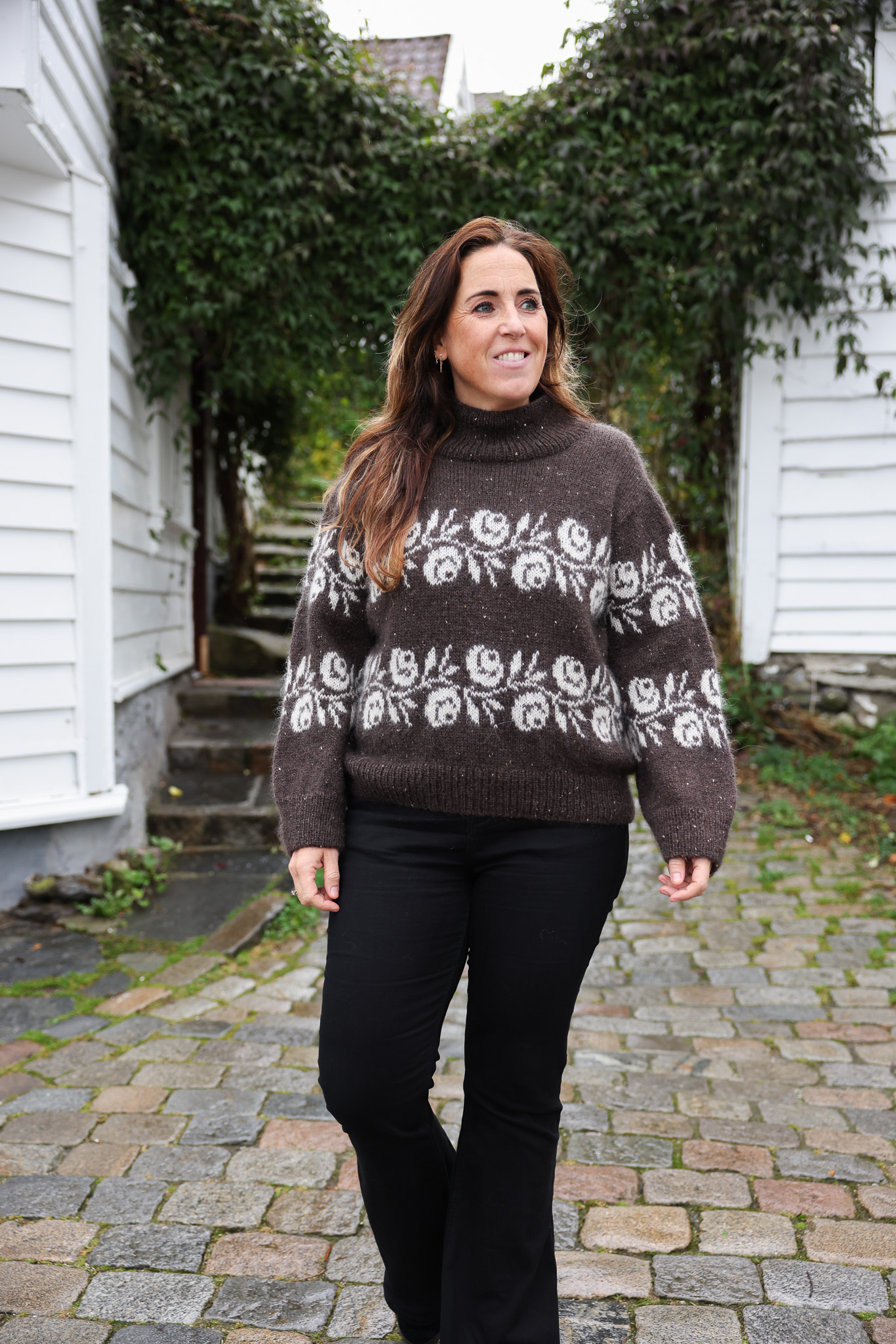Rosie Sweater har to roseborder på bol og ermer, og den snedige konstruksjonen er en kombinasjon av ermekuppel og raglan, som vil si at alt mønsteret kan strikkes rundt fra rettsiden.