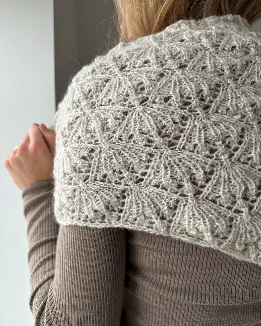A: 1 mønster = 9 cm i bredden på p nr. 5,5 med 2 tråder Tynn Silk Mohair og 1 tråd Mini Alpakka. Etter vask og lett strekk i bredden: 1 mønster = 10 cm i bredden på p nr. 5,5.