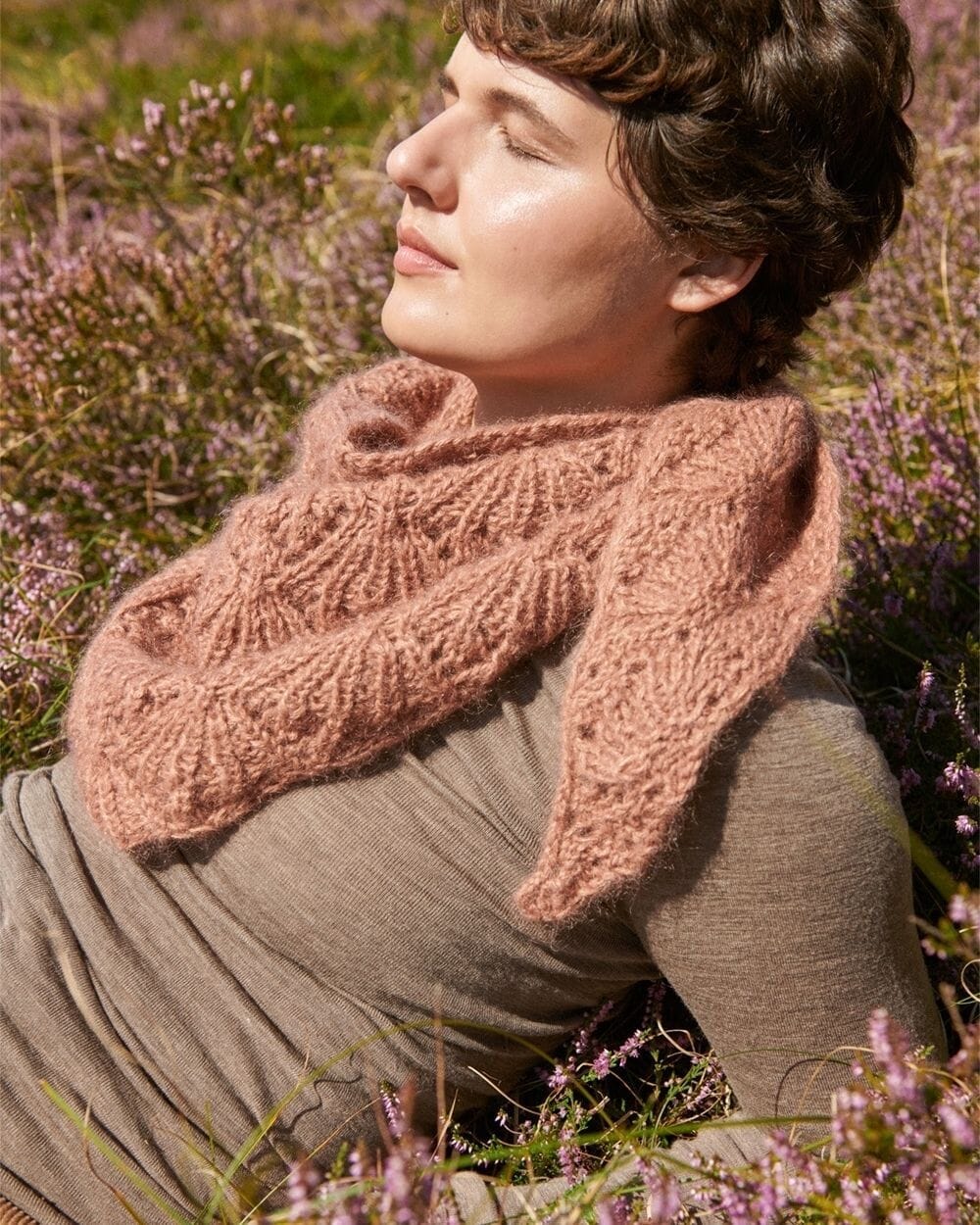 D: Sandnes Garn Tynn Silk Mohair (57% mohair, 28% silke, 15% ull, 25 g = 212 m) strikket sammen med Sandnes Garn Alpakka Følgetråd (100% alpakka, 50 g = 400 m).
