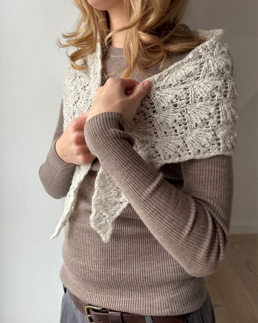 A: Mini Alpakka fg 3553: 100 g, Tynn Silk Mohair fg 3553: 75 g (det holder med 50 g, hvis skjerfet strikkes ca. 1,5-2 mønstre lavere).