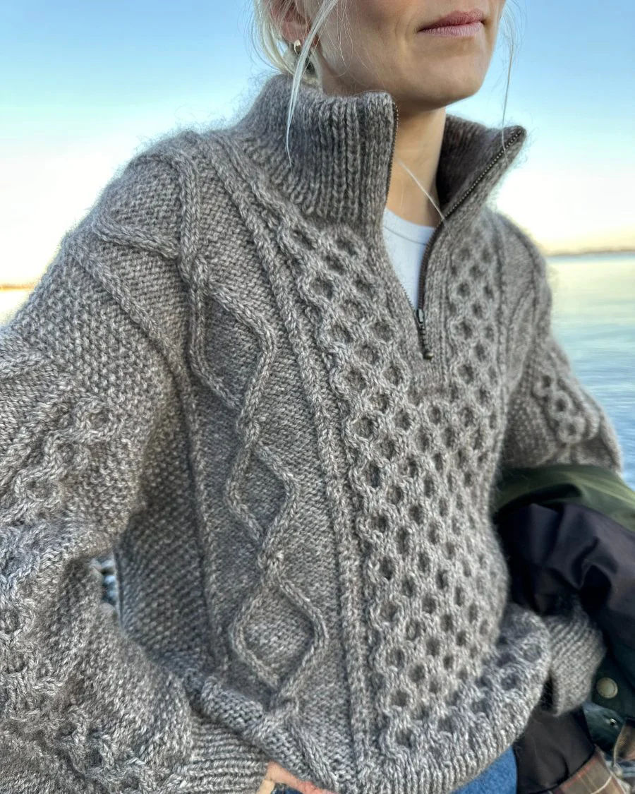 Dagmar Zipper Sweater strikkes ovenfra og ned i strukturstrikk. Genseren strikkes i Peer Gynt og Alpakka følgetråd.