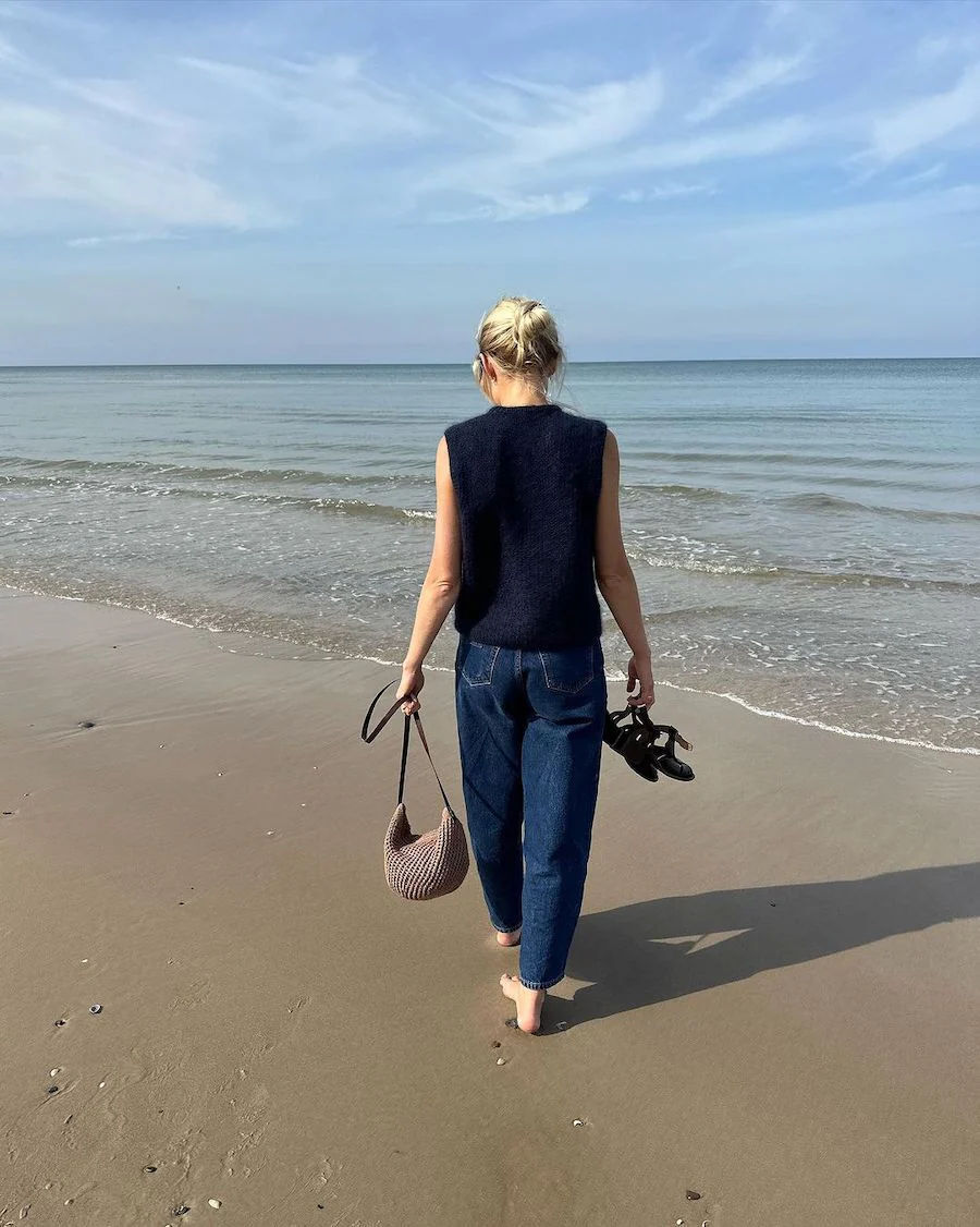 Friday Slipover strikkes ovenfra og ned i perleribb. Først strikkes bakstykket, så skuldre og forstykket og til slutt bolen. Langs halsåpning og ermehull strikkes det til slutt ribbkanter.