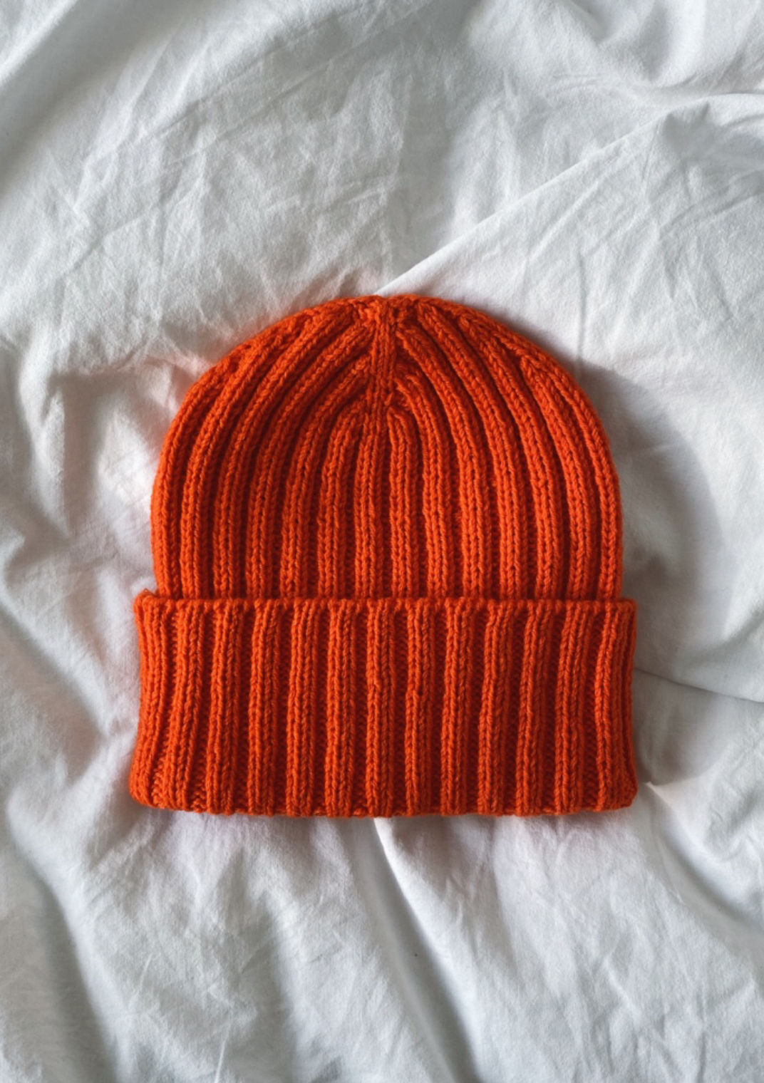 Hipsterlua strikkes nedenfra og opp. Det gjøres en brett nederst på ribbkanten.