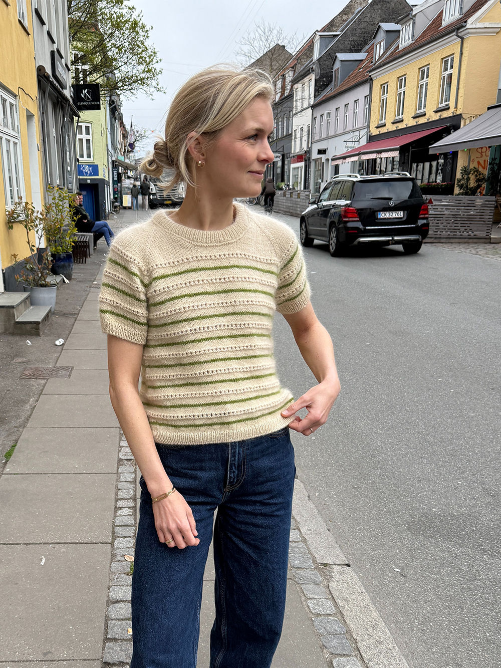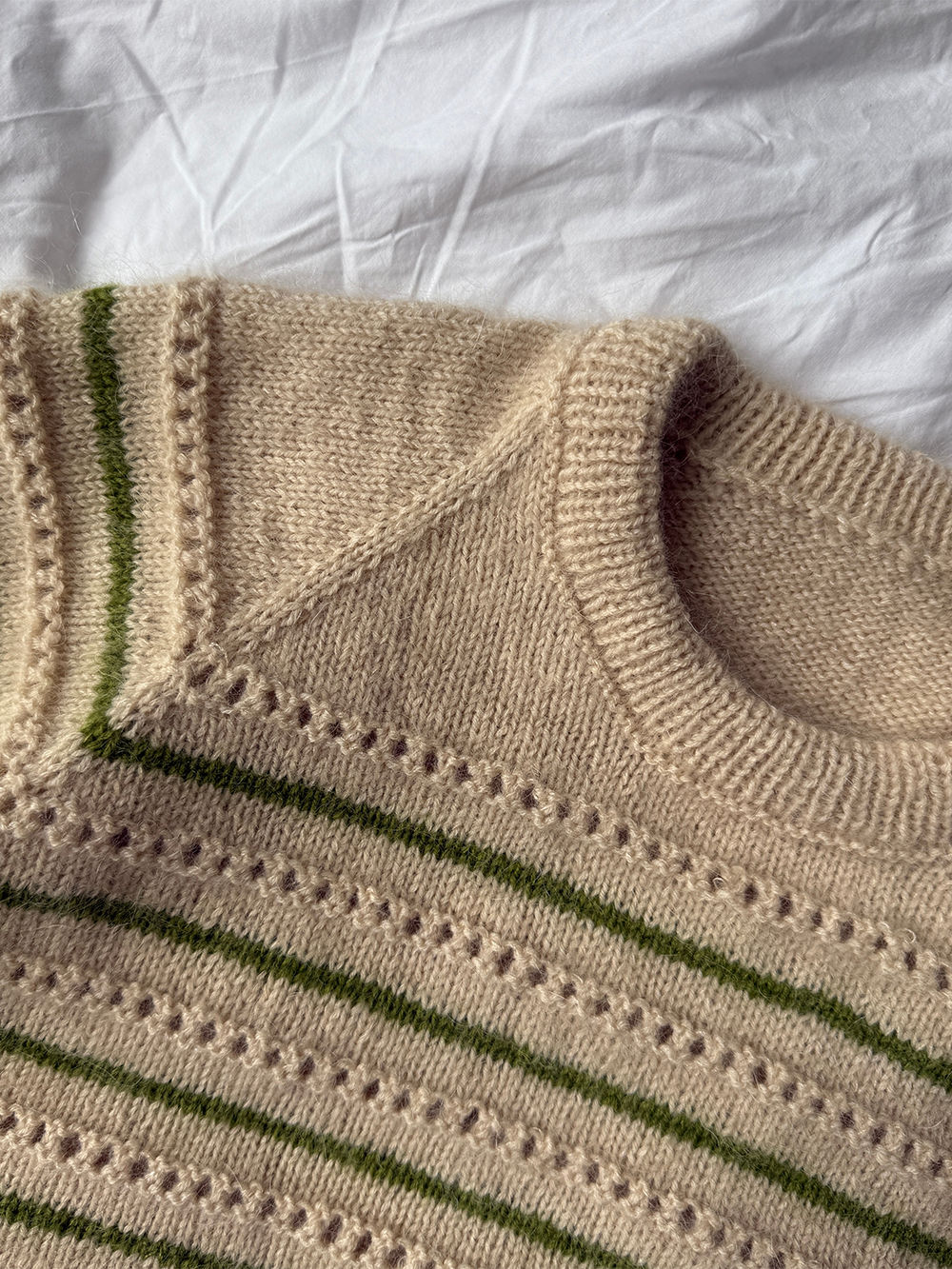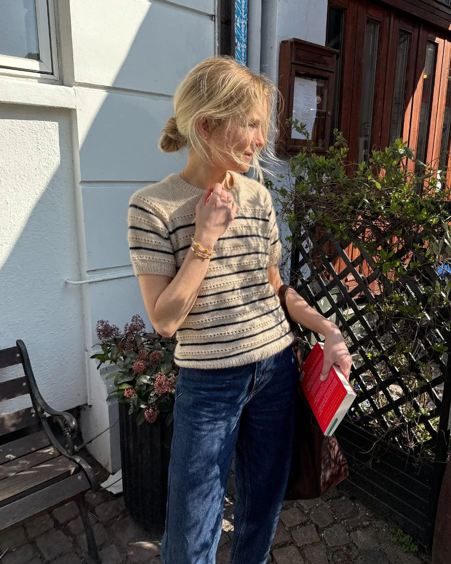 Ida Tee strikkes ovenfra og ned med et mønster av strukturstrikk og striper.
