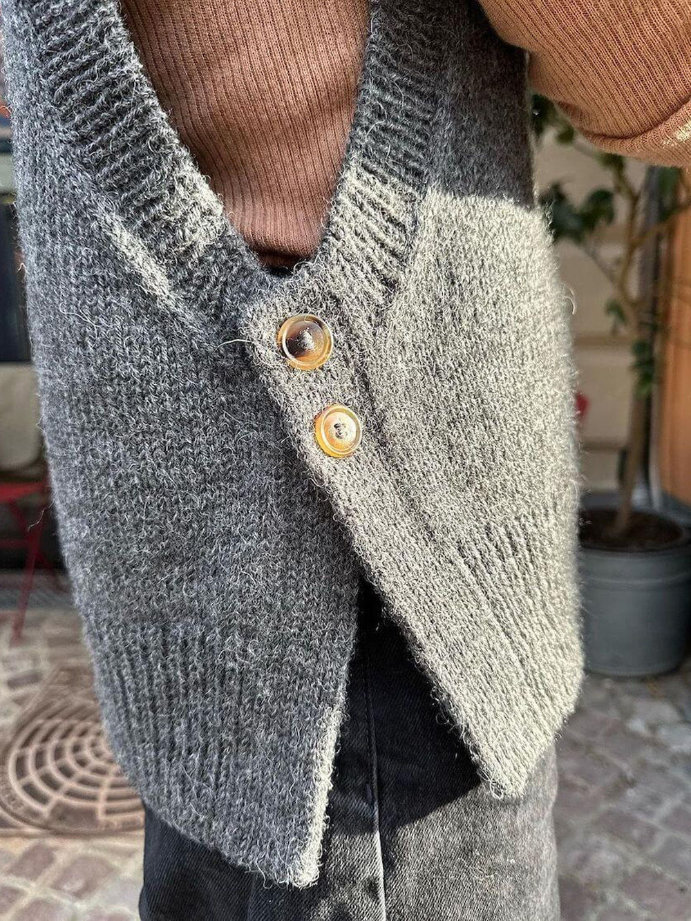 Lulu Slipover strikkes ovenfra og ned. Vesten har dype ermehull og lukkes i sidene med to knapper.