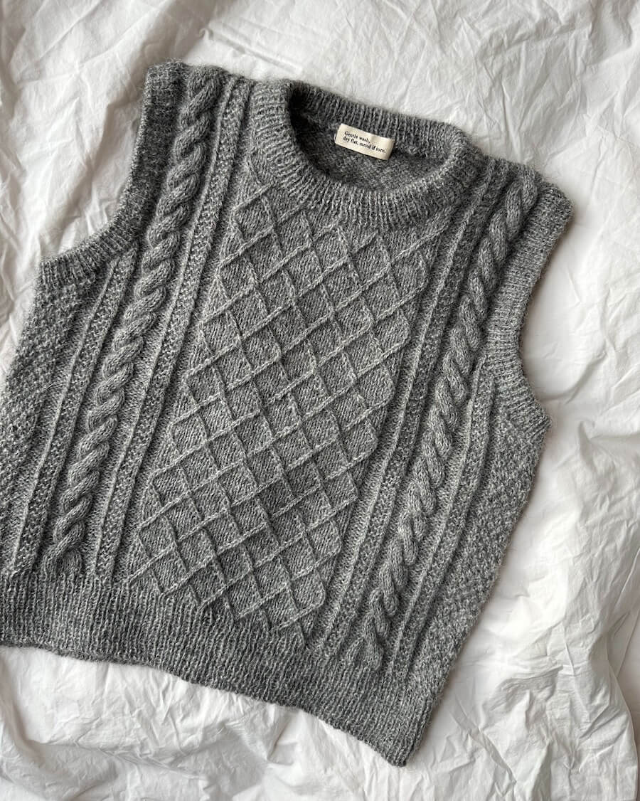 Forslag 2: 200 (200) 200 (250) 250-300 (300) 300-350 (350) 350 g Tynn Peer Gynt fra Sandnes Garn (50 g = 205 m) strikkes sammen med 100 (100) 100 (125) 125-150 (150) 150 (150-175) 175 g Tynn Silk Mohair fra Sandnes Garn (25 g = 212 m)