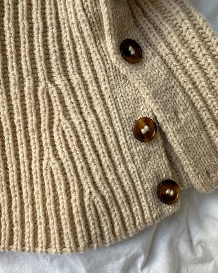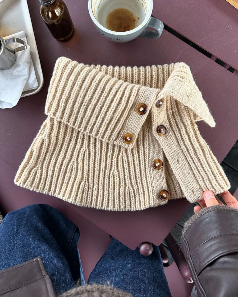 November Neck strikkes ovenfra og ned i patentstrikk med økninger nederst på bærestykket. Langs sidene strikkes det samtidig knappestolper i dobbelstrikk. I den ene knappestolpen strikkes det knapphull, og i den andre monteres det knapper.