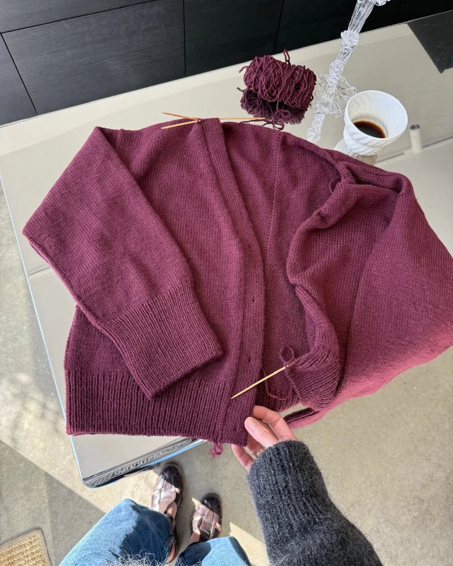 Den burgunderfargede Scarlet Cardigan er strikket i Double Sunday fra Sandnes Garn i fargen Dyp burgunder [4372].