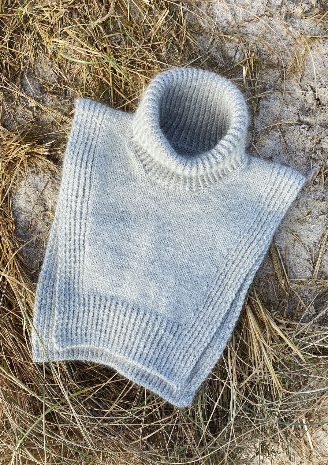 20-22 masker x 24 pinner i vrangbord (1 vridd r, 1 vridd vr) på pinne 4,5 mm = 10 x 10 cm etter vask og blokking (strikkefasthet til polokragen)