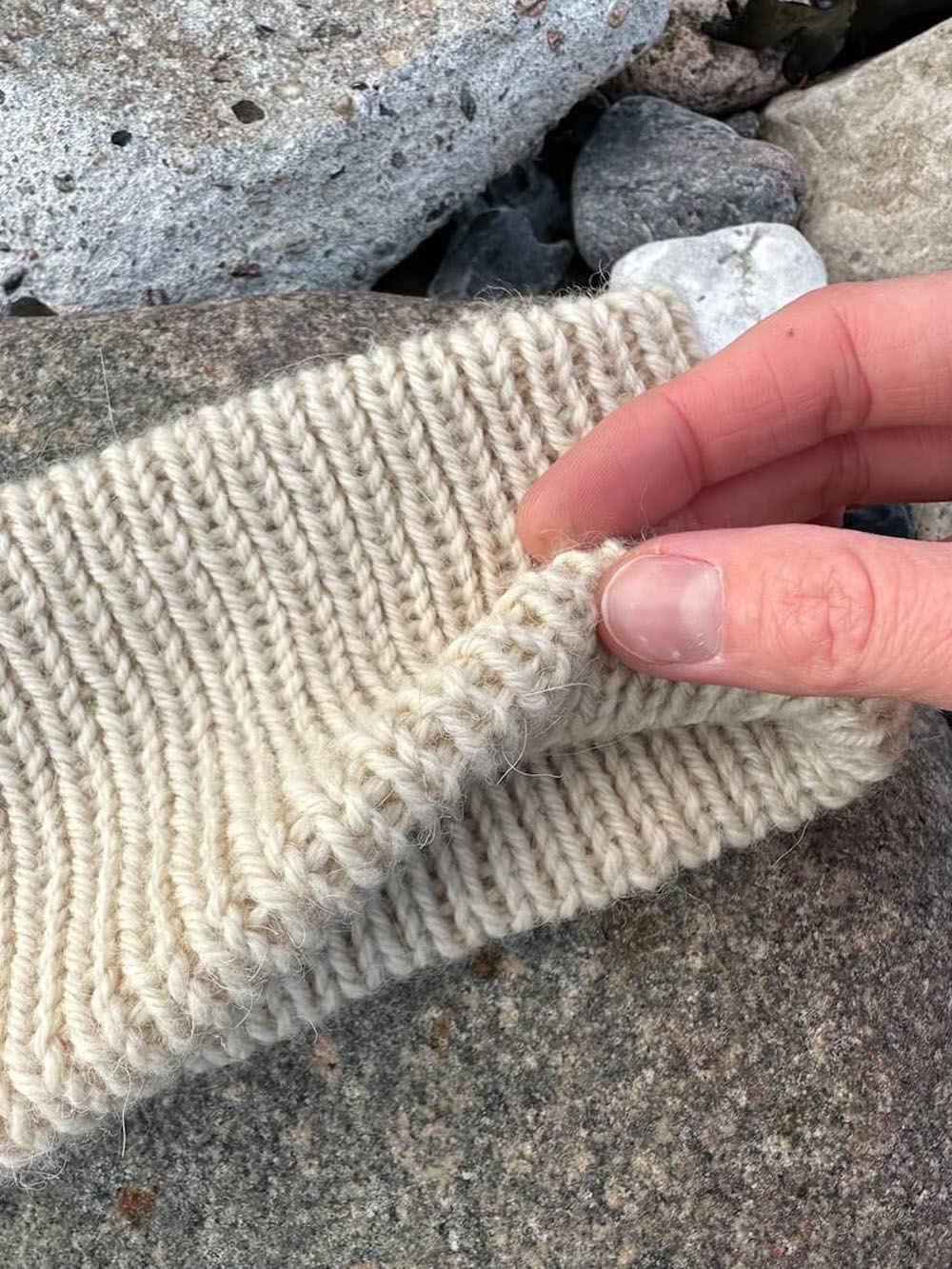 Weekend Pannebånd strikkes rundt i vrangbord og legges dobbelt. Oppleggs- og avfellingskanten sitter midt på innsiden av pannebåndet, og disse sammenføyes til slutt med maskesting i vrangbord. Det strikkes dobbelstrikk langs brettekantene for å sikre at plasseringen av brettekantene blir værende.