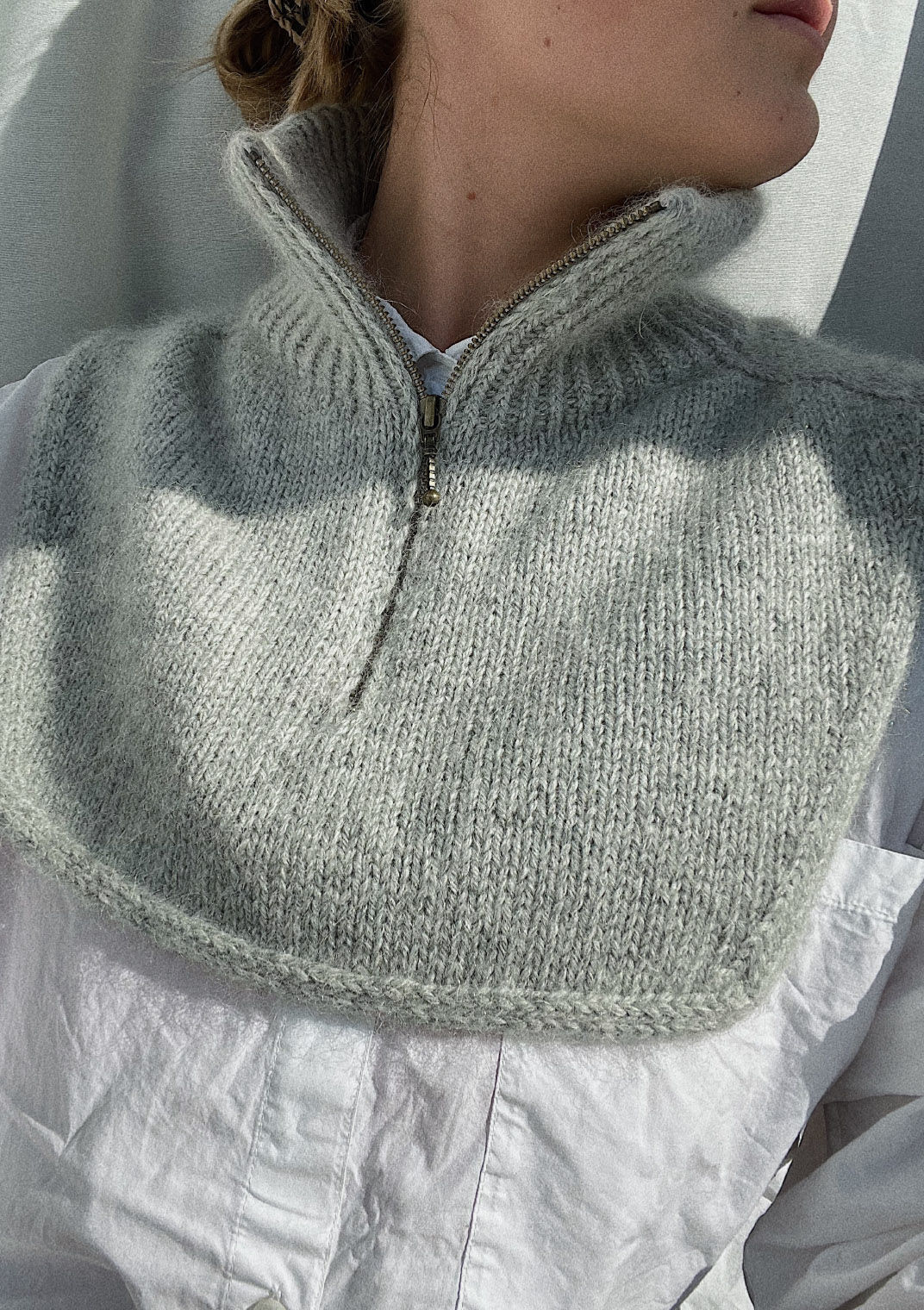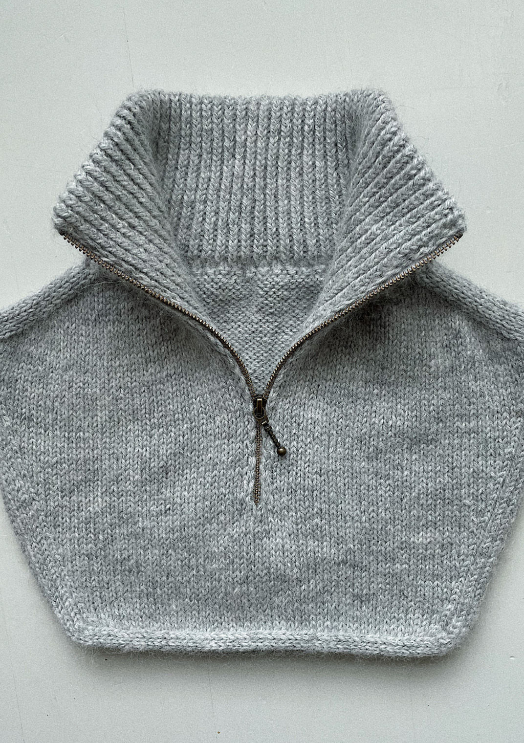 Zipper Neck strikkes ovenfra og ned. Halskanten strikkes i vrangbord som legges dobbelt og strikkes ned. Deretter strikkes skuldrene med økninger på både rett- og vrangsiden, og det strikkes vendepinner for å danne halsutskjæringen. Videre strikkes forstykket og bakstykket. Til slutt strikkes belegget til glidelåsen ut fra hvilende masker, slik at glidelåsen også fremstår pen fra vrangsiden. Glidelåsen monteres til slutt ved å sy den inn mellom de to lagene strikk.