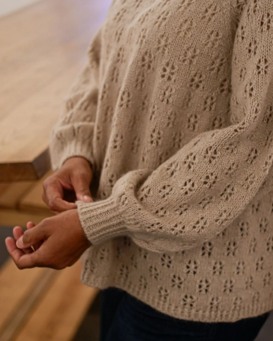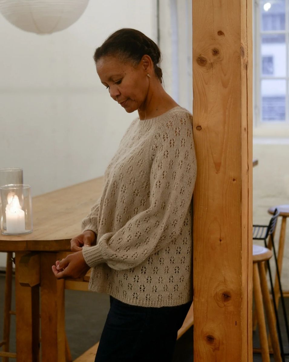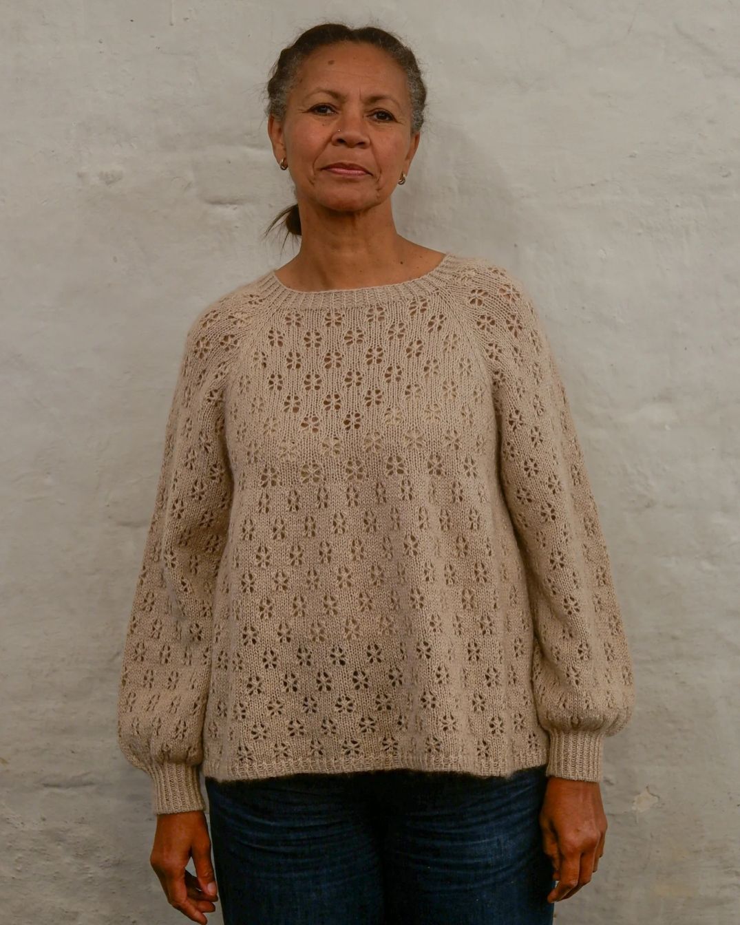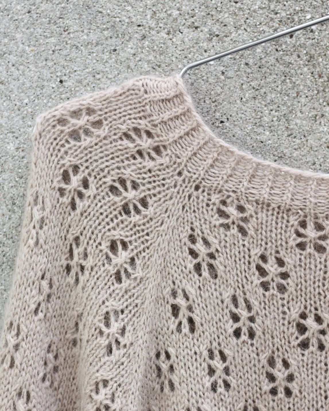 Blusen strikkes ovenfra og ned med raglanøkninger. Blusen har ribbkanter, som står i kontrast til den vide bluse med det feminine hullmønsteret.
