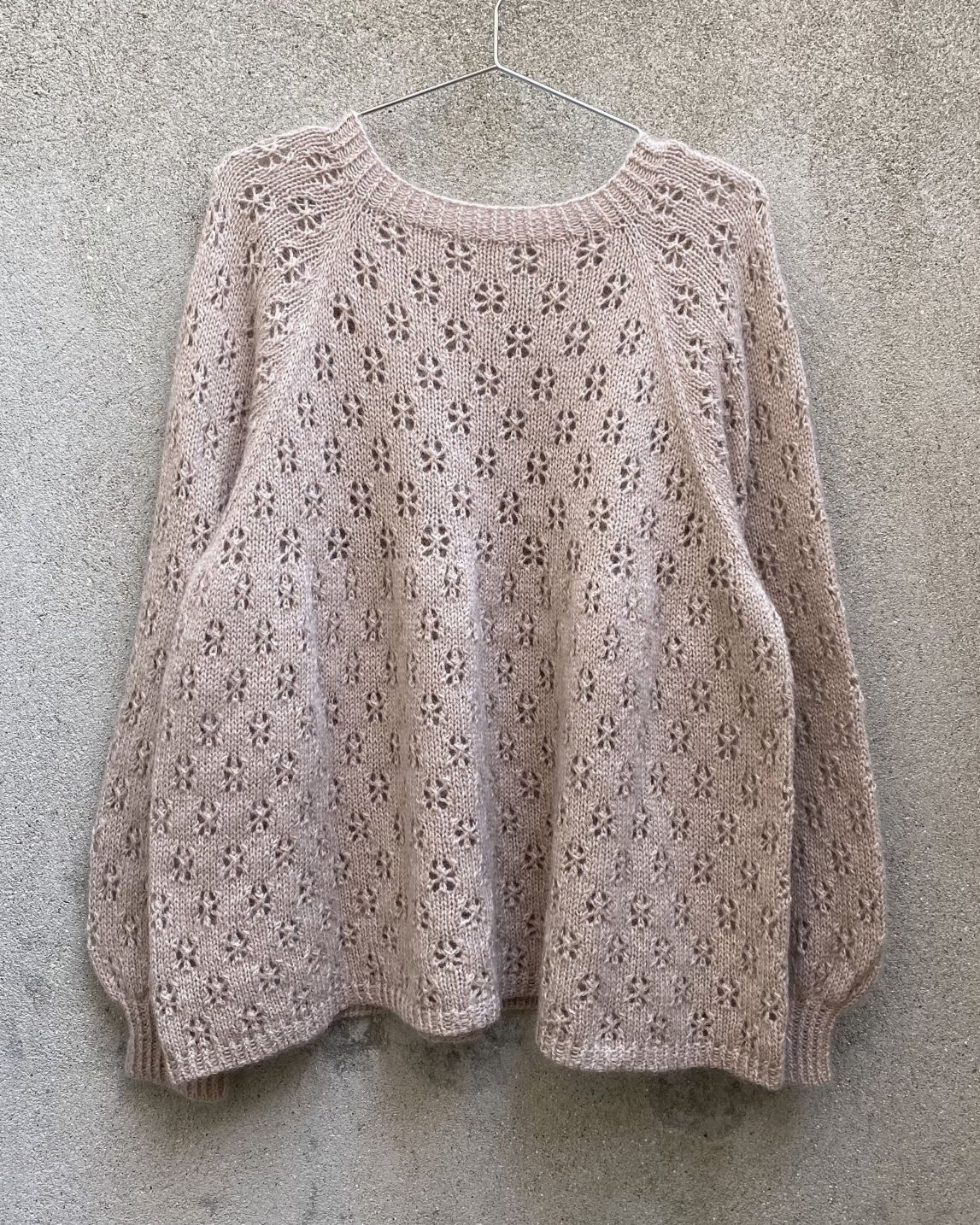 Pizza Blusen er en enkel genser med vidde og et fint hullmønster, som kan gi assosiasjoner til små markblomster - eller små pizzaer.