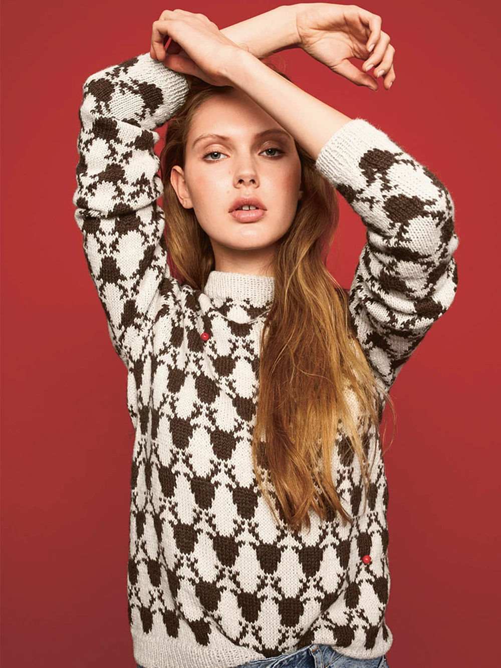 Reinsdyrgenseren er en klassisk raglangenser med reinsdyrmønster – et tidløst og stemningsfullt vinterplagg som passer perfekt både til jul og til turbruk. Genseren strikkes nedenfra og opp i myk Alpakka fra Sandnes Garn, med et vakkert mønster i kontrastfarger og mulighet for å pynte reinsdyrene med små røde «neseperler»