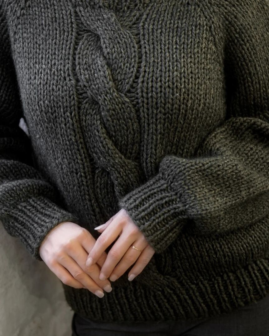 Nydelig genser med stor flette i front. Genseren strikkes med dobbel Heavy merino sammen med to tråder soft silk mohair på pinne nr 10.