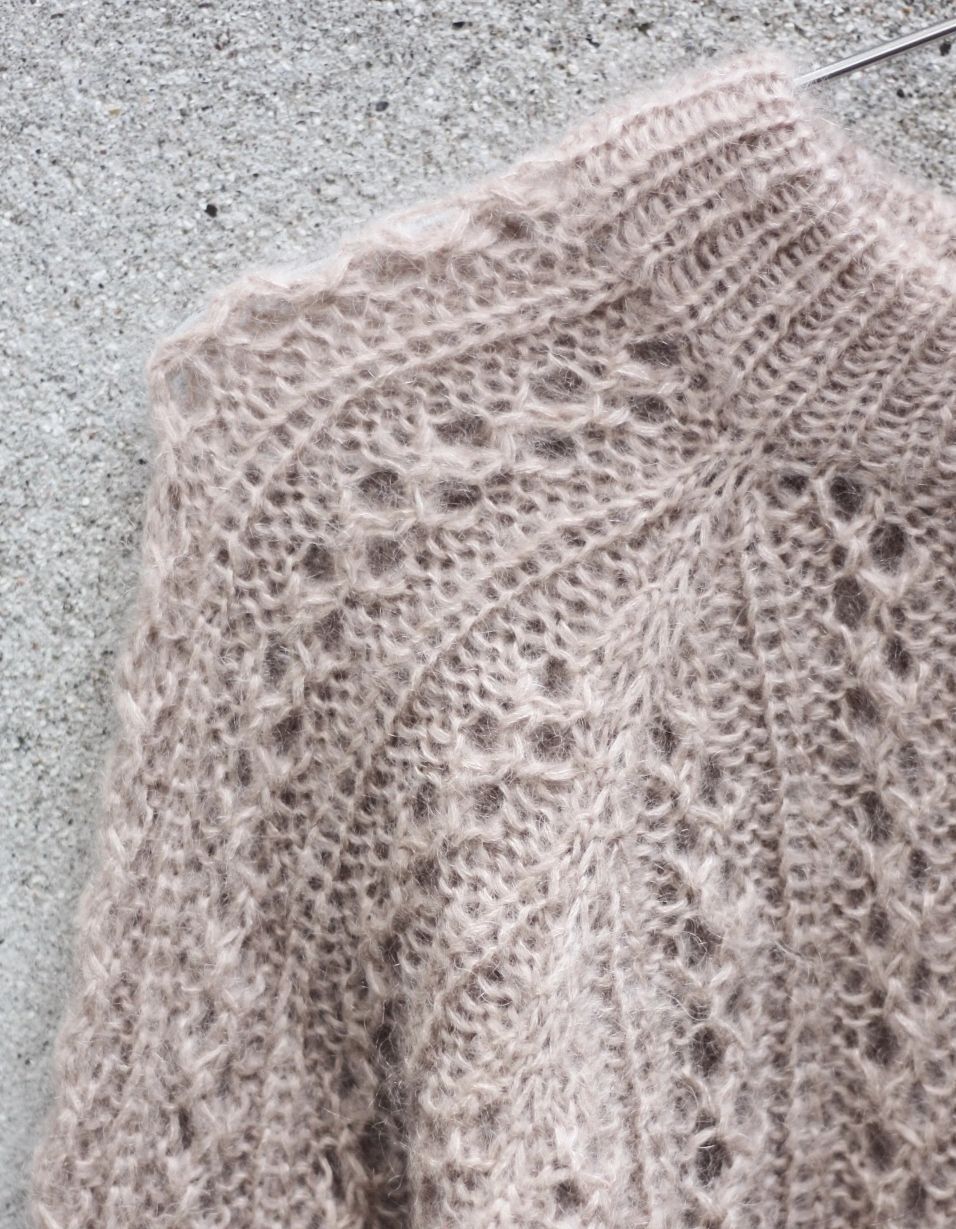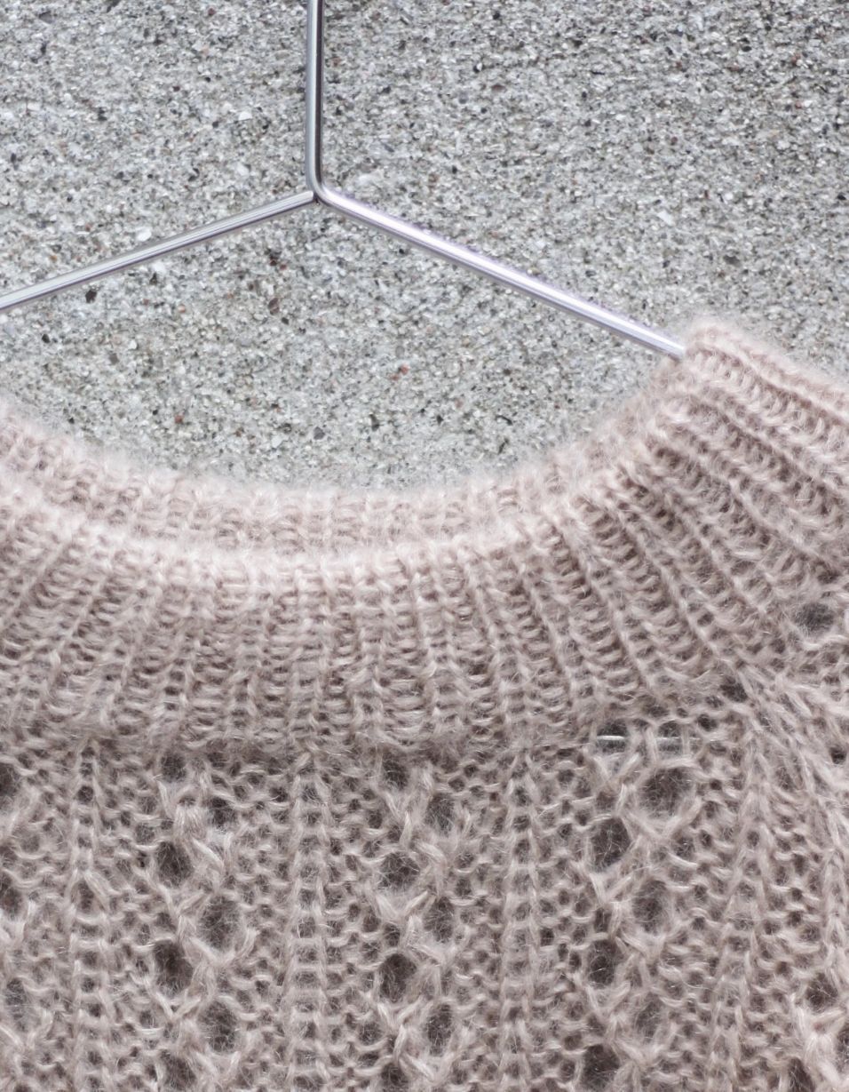 Vaffel Sweater er en myk og lett genser i ren silk mohair i et enkelt og feminint hullmønster, med brede ribbkanter. Genseren strikkes ovenfra og ned i 3 tråder Soft Silk Mohair.