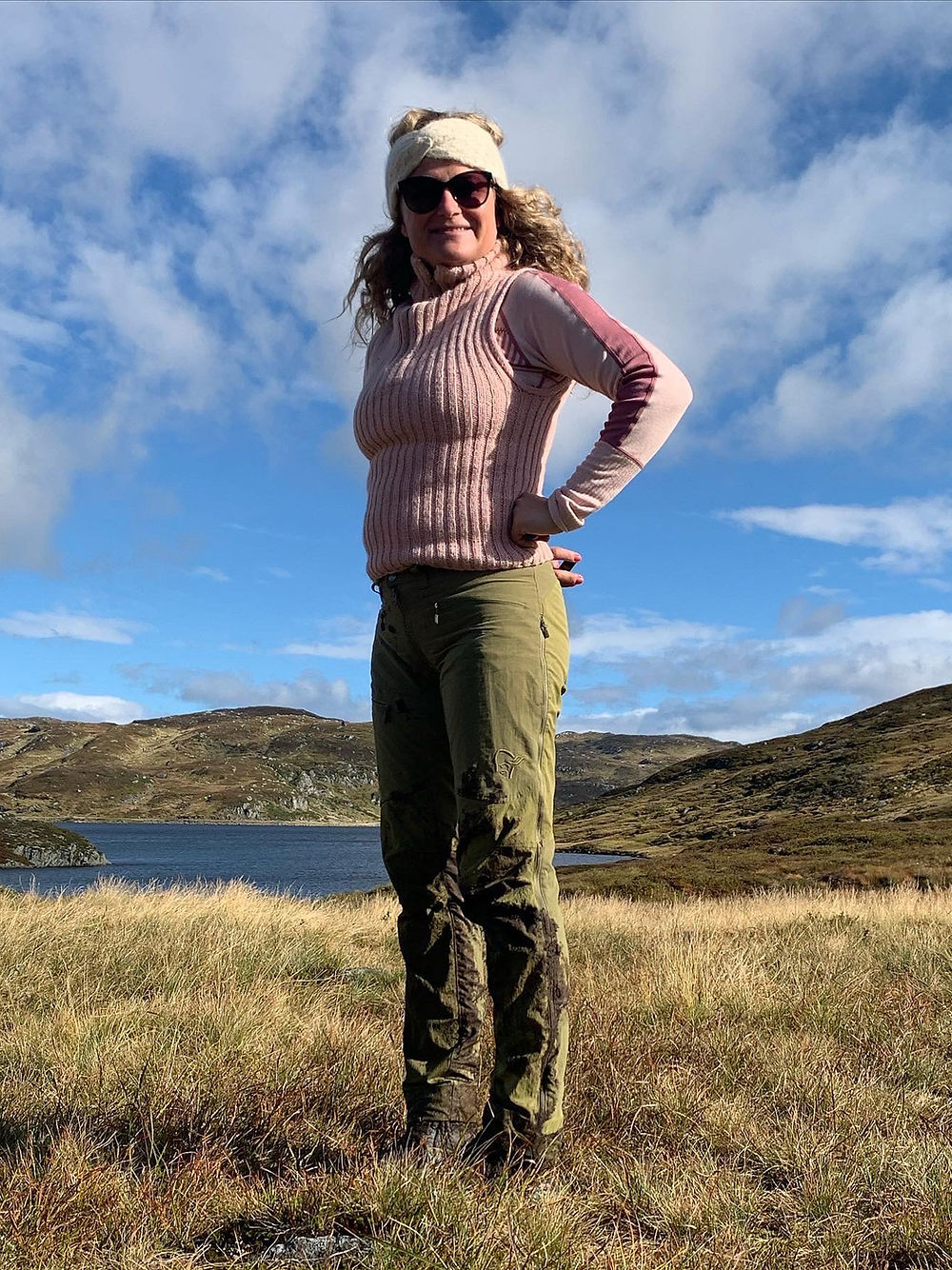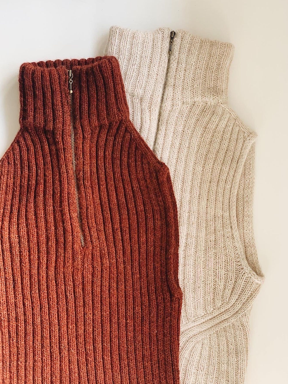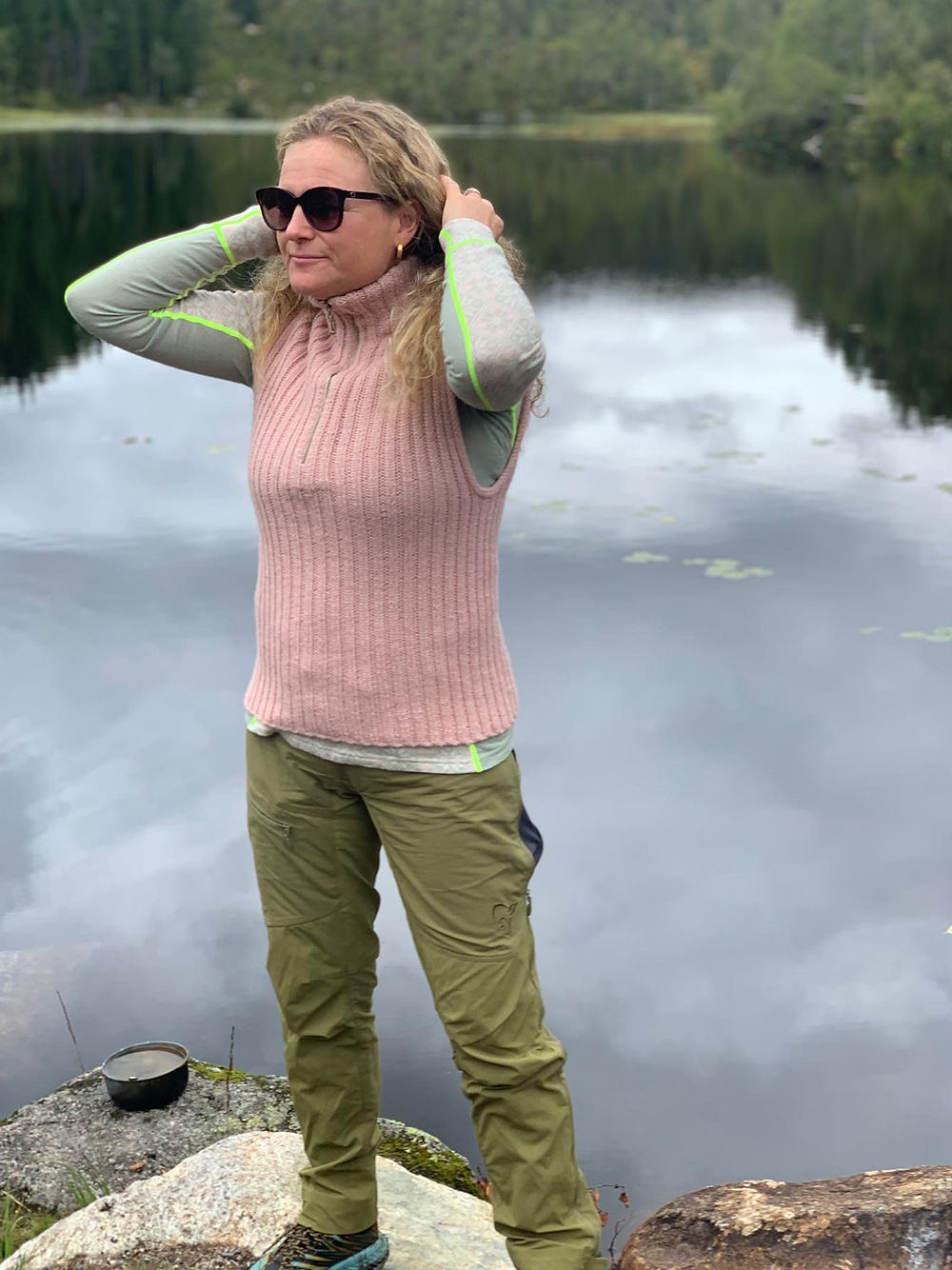 Størrelse: XS (S) M (L) XL (2XL) Overvidde: 72 (76) 88 (100) 108 (116) cm. Lengde: 57 (61) 65 (69) 71 (72) cm ekskl. halskanten. Strikkefasthet: 20 masker x 26 pinner ribbestrikk på p 3,5 = 10 x 10 cm. 18 masker x 30 pinner i glattstrikk på p 3,5 = 10 x 10 cm. Veiledende pinner: 3,5 mm Garn: Peer Gynt Garnmengde: 400 (450) 500 (550) 600 (650) gram Vill i friluftsvesten Vesten strikkes ovenfra og ned i dobbel ribb. Halskanten strikkes dobbelt og strikkes ned. Vesten strikkes høyere bak, ved hjelp av teknikken German Short Rows,samtidig som det økes i parvist i alt 4 ganger per omg. Når mengde masker er oppnådd, felles skuldermaskene, og for- og bakstykket strikkes hver for seg. Når ønsket lengde er oppnådd på for- og bakstykke, samles disse og det strikkes rundt. Det felles det av med italiensk avfelling på bolen for å få en fin og elastisk avfelling. Rundt ermeåpningene hentes det opp masker og strikkes i-cord kant. Ellers strikkes hele vesten i dobbel ribb, 2 r og 2 vr. Helt til slutt strikkes det opp belegg til glidelåsen ut fra hvilende masker, da vil glidelåsen også fremstå pen fra vrangsiden. Glidelåsen monteres til slutt for hånd. Strikk gjerne en prøvelapp før du starter, for å sjekke at strikkefastheten stemmer. Merk at strikkefastheten er oppgitt i ribbestrikk og glattstrikk etter oppskylling. Størrelser Vill i friluftsvesten er en tettsittende modell. Brystmål på omtrent 72 - 80 (80 - 88) 88 - 96 (96 - 104) 104 - 112 (112 - 120) cm tilsvarer størrelse XS (S) M (L) XL (2XL). Det vil si at dersom du måler ca 85 cm rundt brystet skal du strikke en str S. Mål deg selv før du går i gang med å strikke. Den vil tilpasse seg kroppen, og vil gjerne strekke seg 15 - 20 cm uten at det ødelegger uttrykket. Dvs at overvidden som er oppgitt i oppskriften er når ribben ikke er strukket. Størrelsene tilsvarer alminnelige europeiske størrelser, men er du i tvil kan det være lurt å gå ned en størrelse.