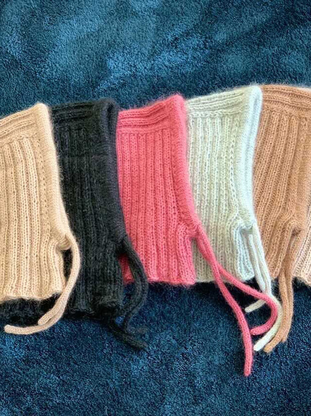 Strikkefasthet: 18 masker x 22 pinner dobbel ribb på pinne 6 = 10 x 10 cm.