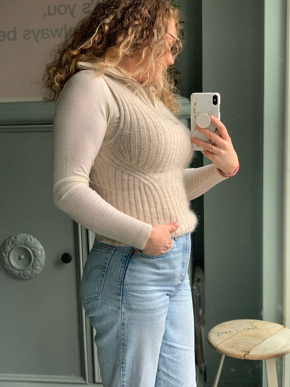 Rundt ermeåpningene hentes det opp masker og strikkes i-cord kant. Ellers strikkes hele vesten i dobbel ribb, 2 r og 2 vr.