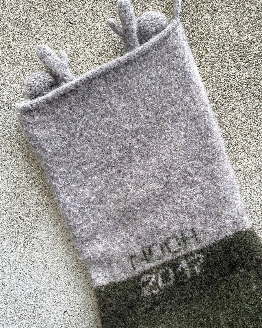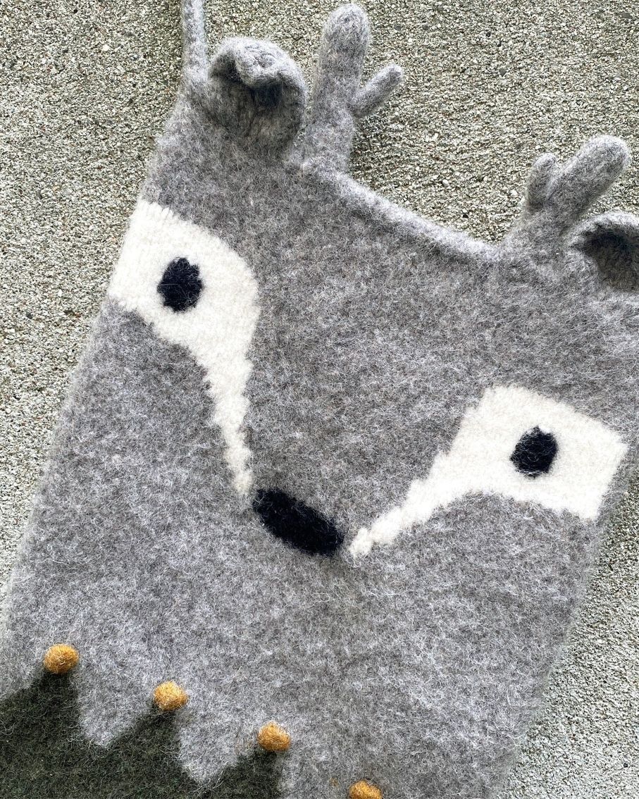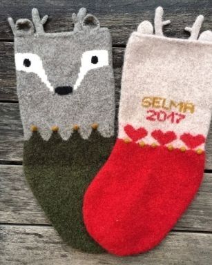 Ører, gevir, kant og stropp strikkes på til slutt, og navn og årstall broderes bakpå sokken. Sokken vasken til slutt i vaskemaskinen på 40° C grader, så sokken toves.