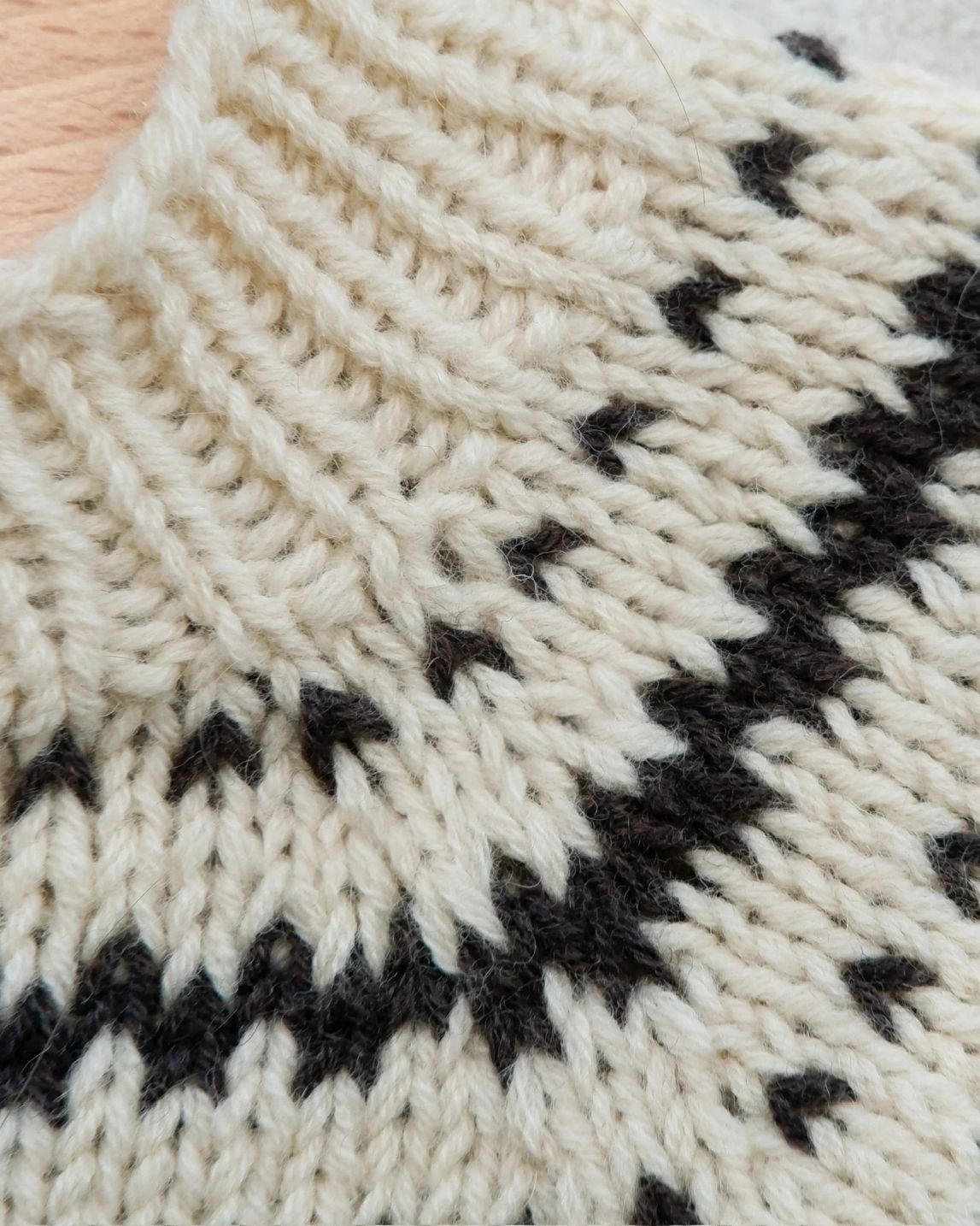 Modellen på bildet er strikket i 2 tråder Merino, Ufarget og Brunbjørn
