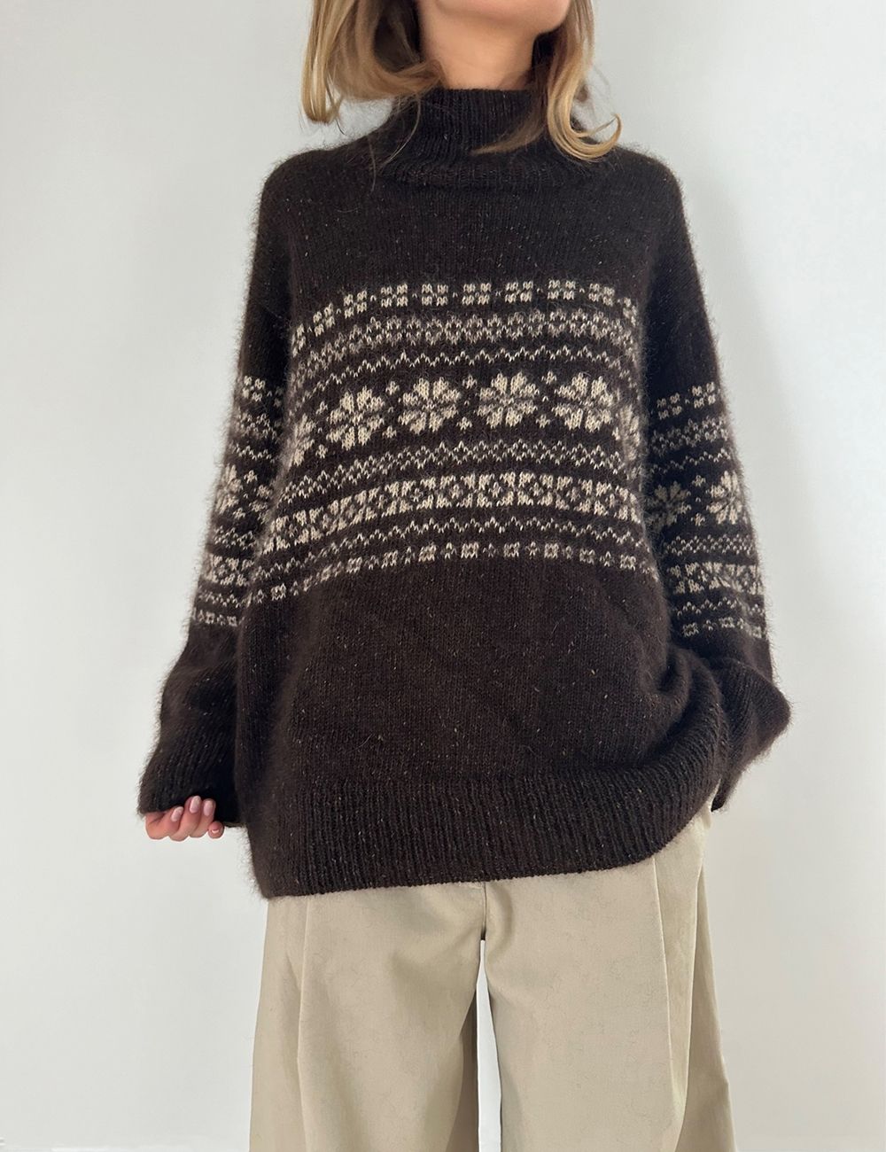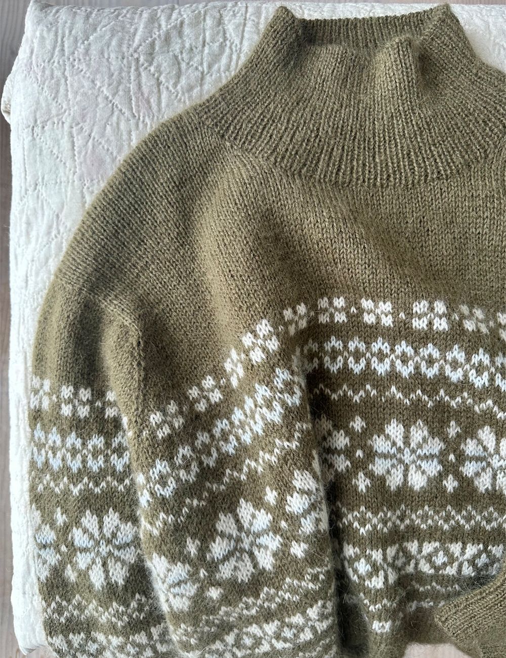 Harriet Sweater er romslig, og den smarte konstruksjonen er en kombinasjon av ermekuppel og raglan, som betyr at alt mønster kan strikkes rundt fra rettsiden. Harriet Sweater er forholdsvis lang, men fordi den strikkes ovenfra, er det enkelt å justere lengden hvis du ønsker den kortere.