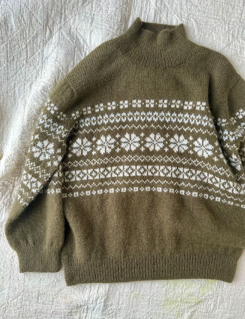 Garn og garnmengde – olivengrønn genser