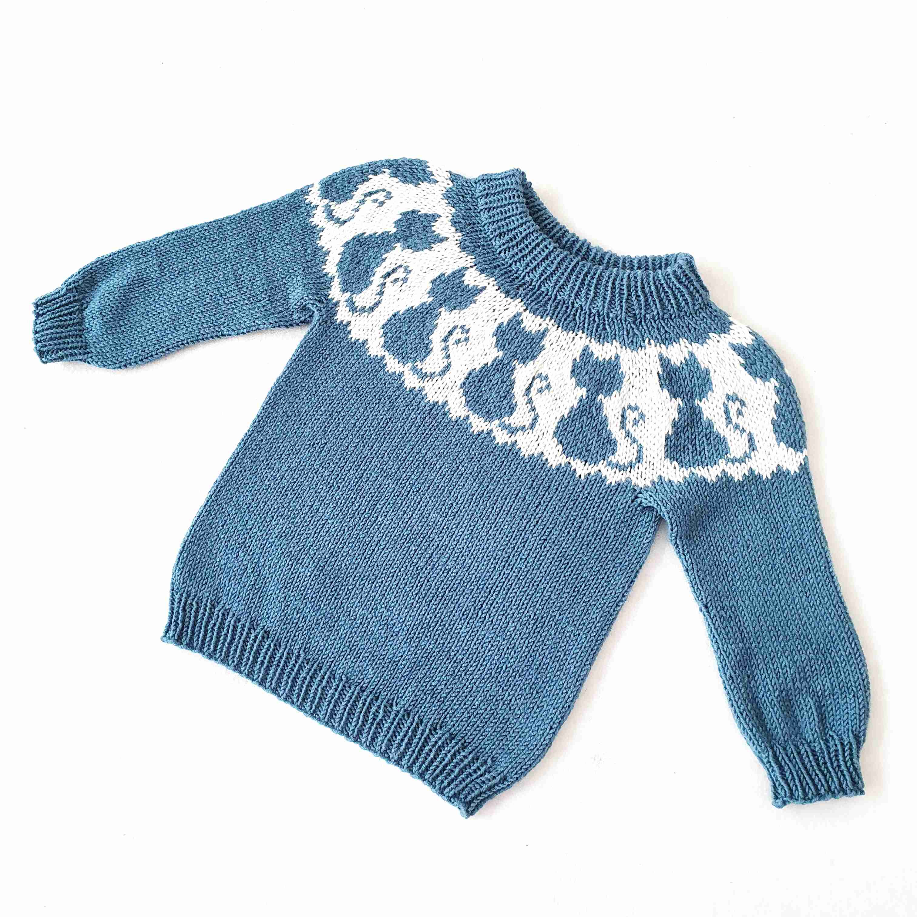 Tenkepusgenser er en sjarmerende barnegenser med små katter på bærestykket – perfekt for alle små dyrevenner! Genseren strikkes ovenfra og ned i Sandnes Double Sunday, som gir et mykt og slitesterkt resultat med god passform