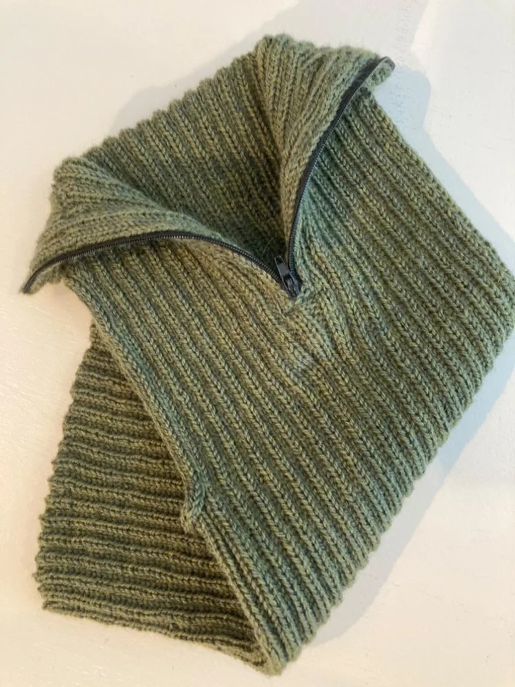 Når ønsket lengde på bolen er oppnådd, felles det av med dobbel italiensk avfelling. Rundt ermeåpningene hentes det opp masker som igjen felles av med i-cordkant. Helt til slutt strikkes det opp belegg til glidelåsen ut fra hvilende masker, da vil glidelåsen også fremstå pen fra vrangsiden. Glidelåsen monteres til slutt for hånd.