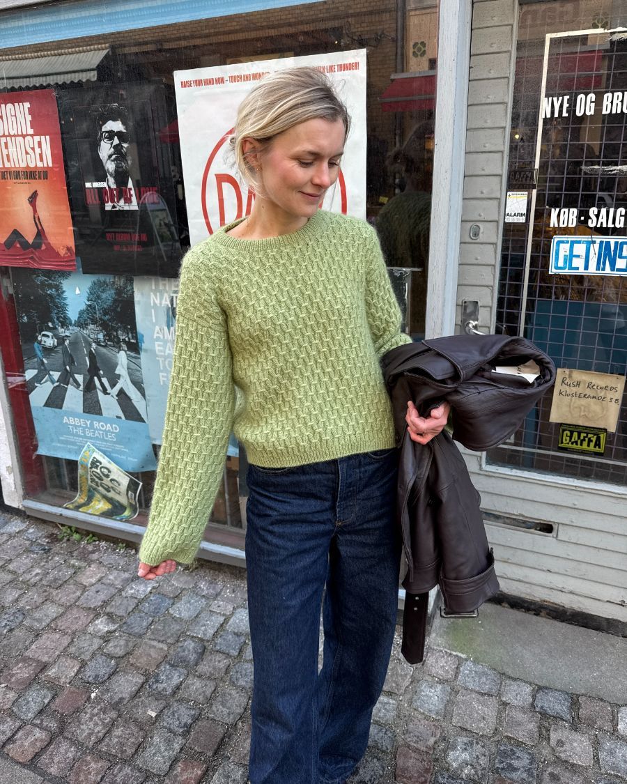 Den grønne Jenny Blouse er strikket i Sunday fra Sandnes Garn i fargen Green tea [9533] sammen med Silk Mohair fra Isager i farge 57.