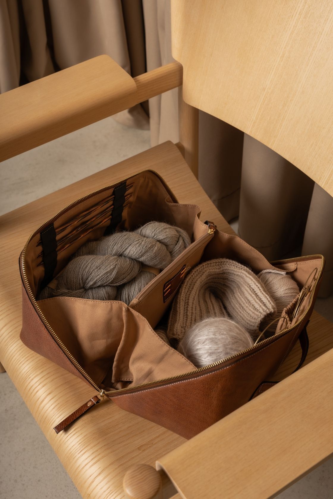 PROJECT 10 er en elegant skinnveske, designet for strikkeentusiaster som verdsetter både stil og funksjonalitet. Håndlaget med stor nøyaktighet, har vesken et eget område for strikketilbehør som saks, maskemarkører og nåler. Gjennomtenkte lommer og løkker sørger for at alt utstyret ditt holder seg organisert og lett tilgjengelig. Laget i vårt Urban-skinn, som bevarer den naturlige strukturen i kuskinnet, gir vesken en myk og glatt overflate med unike detaljer.